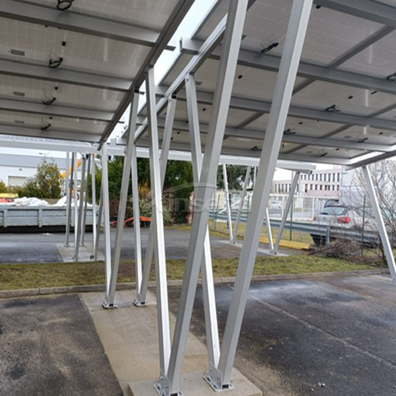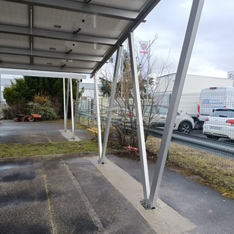Descrição: O sistema de garagem solar é organizado com vãos razoáveis de acordo com as necessidades de estacionamento dos clientes, facilitando a entrada e saída de veículos. Adota suportes de alumínio pré-montados altos para instalação rápida no local