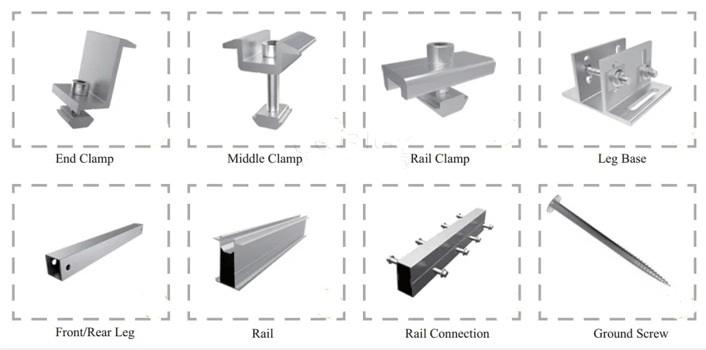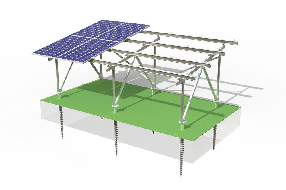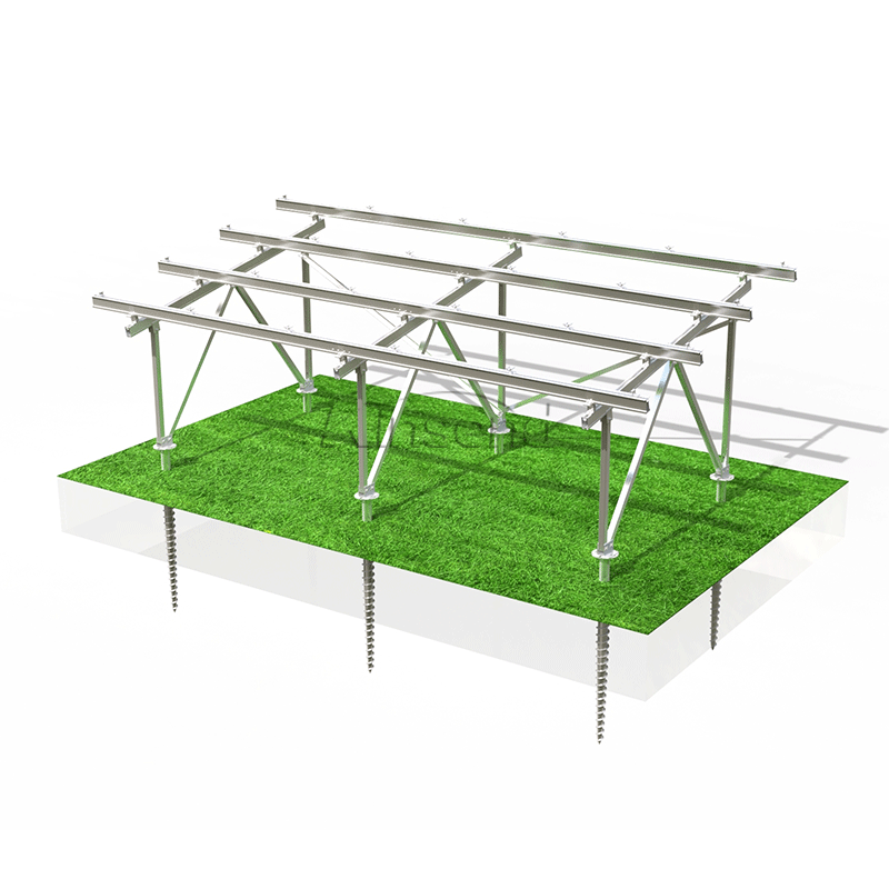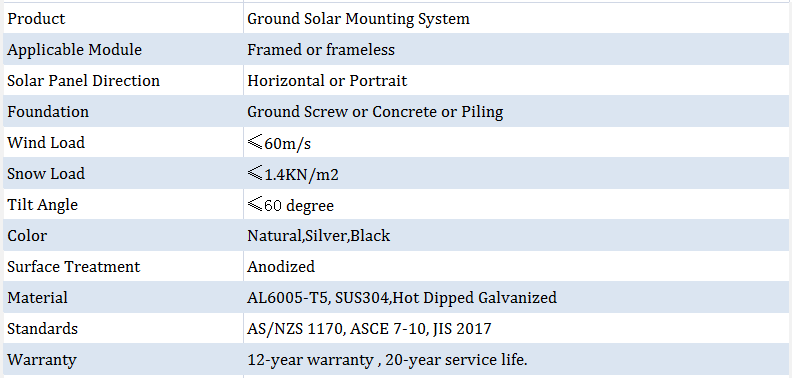 O Sistema Solar de Montagem no Solo é normalmente aplicado em terreno plano aberto. Os componentes principais são pré-montados em nossa fábrica, o que economiza muito tempo e custo de instalação no local. Os componentes são totalmente anodizados mesmo para peças pequenas, o que tem um ótimo efeito anticorrosivo e longa vida útil.