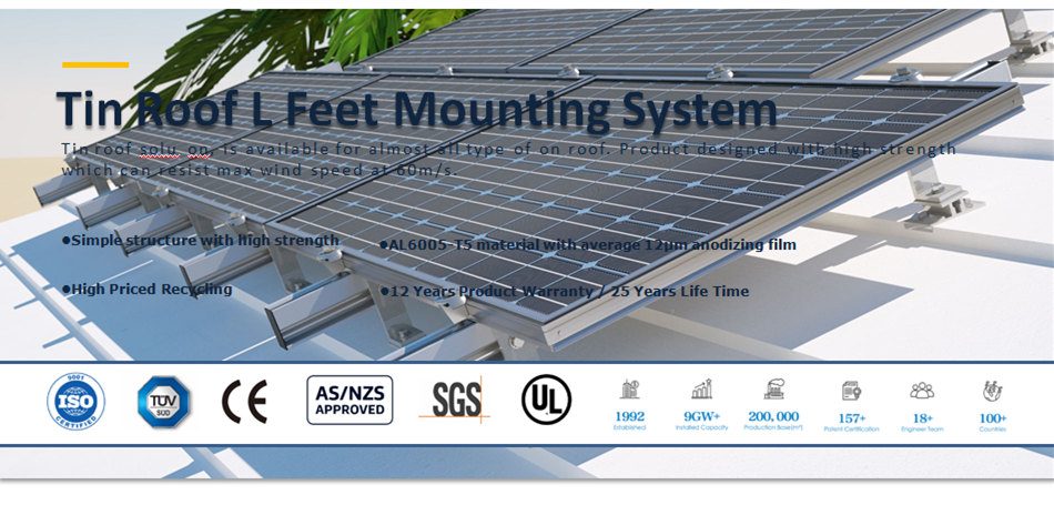 Sistema de montagem solar do telhado do metal Parafuso solar do gancho Pés solares de L , as peças foram pré-montagem alta na fábrica para economizar seu tempo de instalação.Instale na chapa metálica trapezoidal e ondulada. Altura ajustável através de furo alongado no suporte de chapa.