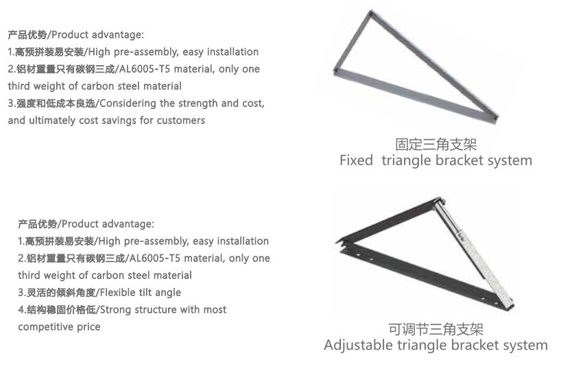 Tripé angular de montagem de painel solar de telhado de metal alumínioPode ser instalado na braçadeira de telhado de metal ou penetrar no concreto. Altamente pré-montado, fácil instalação Perfeito também para pequenos sistemas de 1,2,4 ou 8 módulos, Ângulo fixo, ângulo ajustável ambos disponíveis.