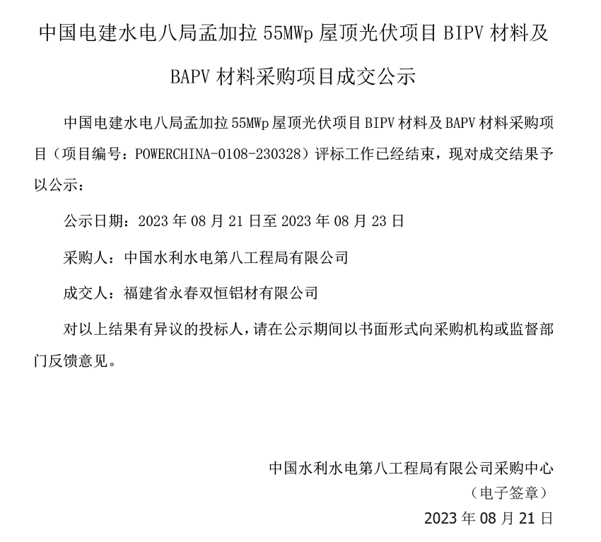 Estamos honrados em assinar um novo contrato de cooperação com a Power China . O projeto BIPV de telhado de 55 MW autorizou com sucesso a Kinsend (Shuangheng Aluminium) como fornecedora de sistemas de montagem solar em Bangladesh.