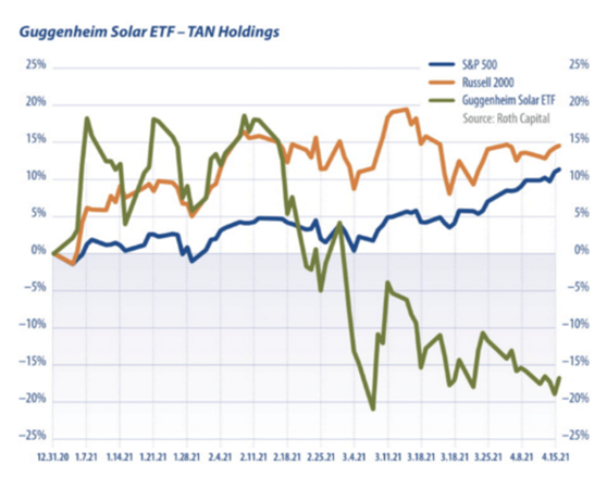 Em abril deste ano, Invesco ETF solar, que faixas Mac's Índice Solar Global, realizado significativamente pior do que S & P 500 e Dow Jones Industrial Índice. O Guggenheim Solar ETF (TAN) caiu 8,7%, enquanto o S & P 500 e Dow Rose 3,4% e 2,7% respectivamente. Em comparação com dezembro do ano passado, o Guggenheim Solar ETF (TAN) subiu 23,2%, enquanto o padrão & Pobre 500 índice e o Dow O índice de Jones subiu apenas 2,6%.