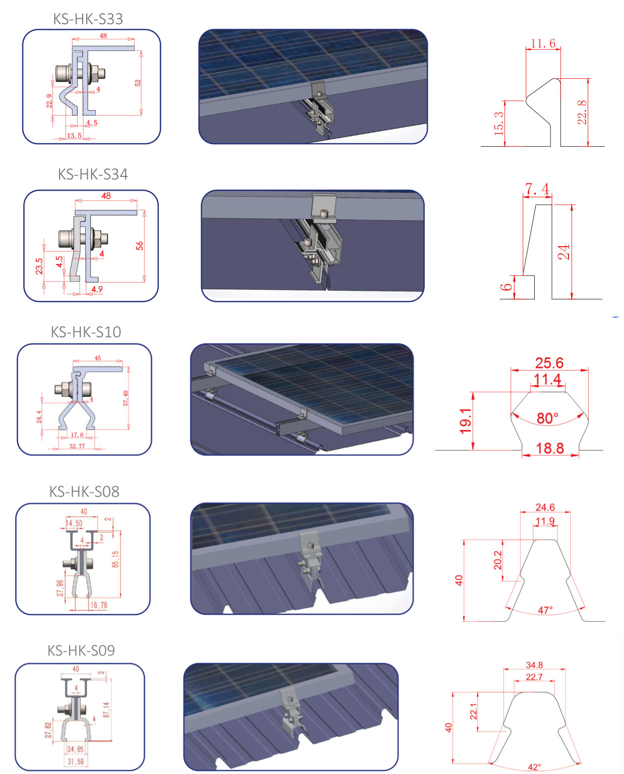 As  braçadeiras de telhado de costura vertical  tornam a montagem em telhado de costura dobrada particularmente fácil. Os grampos são simplesmente presos às costuras em pé. Vários tipos de grampos podem ser combinados de acordo com a  montagem do telhado inclinado , de modo que possam ser fixados firmemente para garantir a firmeza de todo o sistema. Possibilita que seja conectado rapidamente a todos os componentes do trilho.