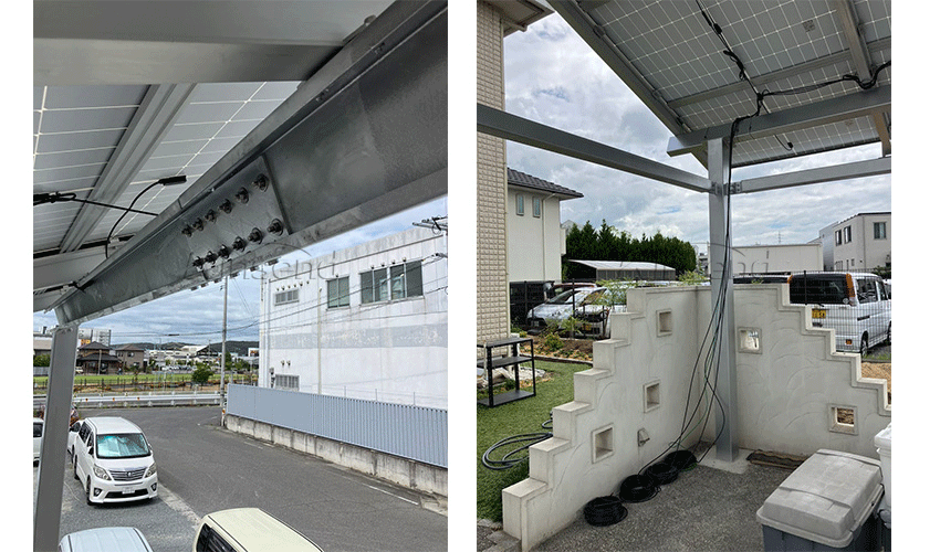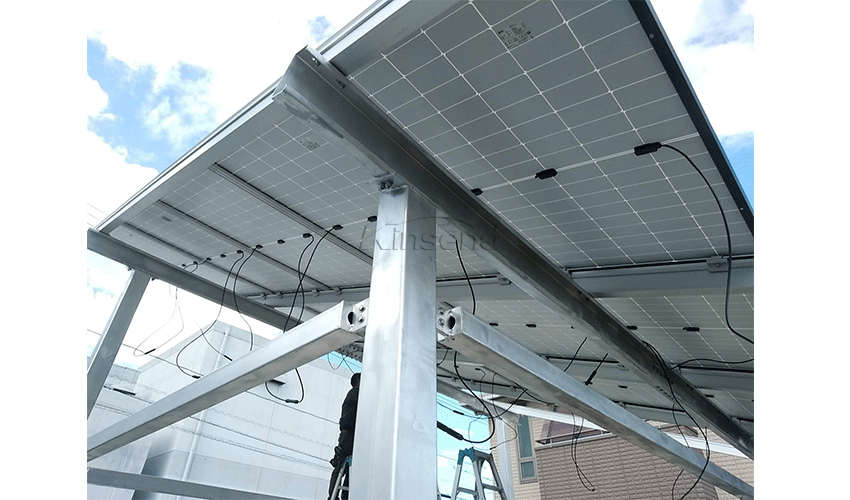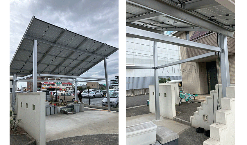 A nova garagem solar à prova d'água Kinsend foi instalada com sucesso no Japão. A base é fixada com parafusos embutidos e em seguida o concreto é irrigado e nivelado. O suporte de aço carbono de alta resistência tem alta estabilidade e pode suportar painéis de bateria de grande porte. Possui boa resistência sísmica, resistência ao vento, resistência à pressão da neve e resistência à corrosão.